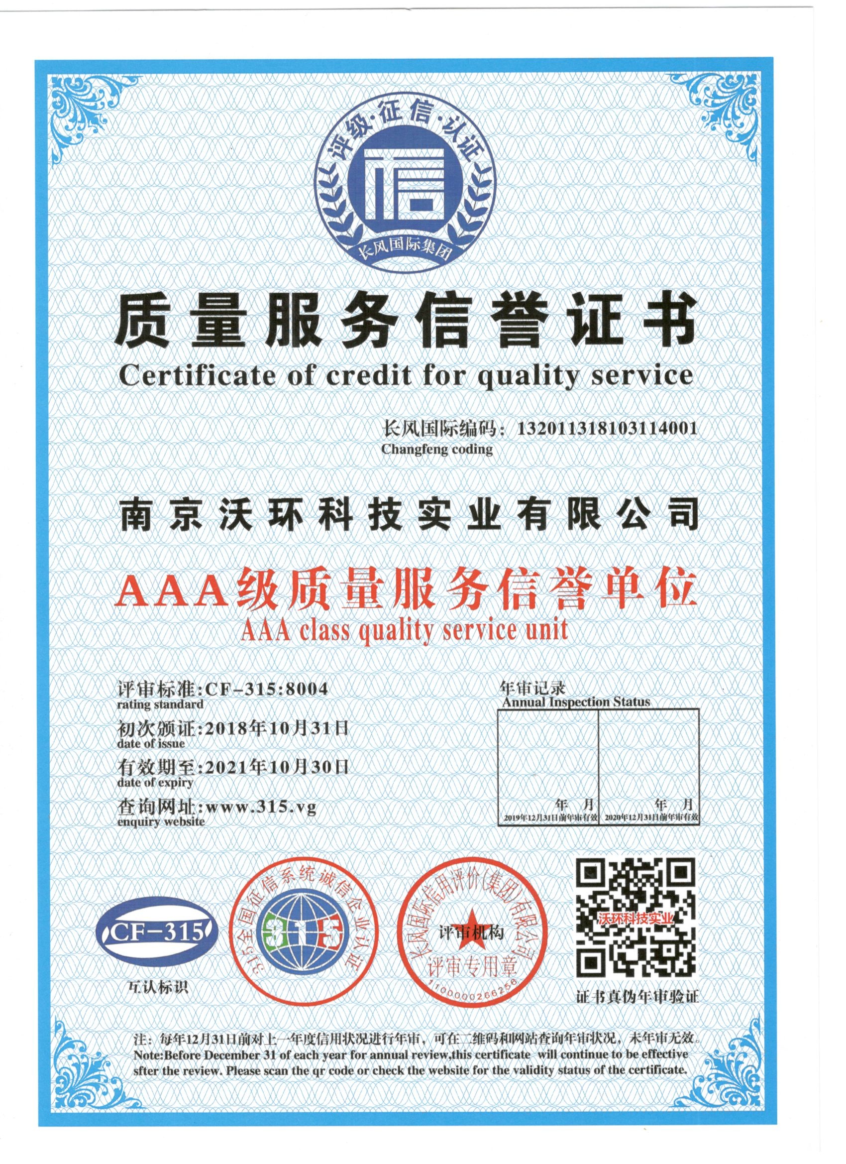 熱烈祝賀南京沃環(huán)公司被專業(yè)評審機構(gòu)-長風(fēng)國際集團評為AAA級質(zhì)量服務(wù)信譽,特發(fā)此證書